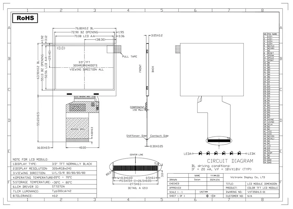 TFT LCD, görüntü keyfiyyətini artırmaq üçün nazik film tranzistor texnologiyasından istifadə edən maye kristal ekranın bir növüdür və gündəlik həyatda çox sayda tətbiqetmələr var. Çində peşəkar bir TFT modulu istehsalçısı və təchizatçı kimi, Viktroniks 3.5 düym 320 × 240 qvga IPS TFT modulu olan digər istehsalçılardan fərqlənir? Birincisi, bütün istiqamətlərdə 300 CD / M², geniş 80 ° baxış bucaqları və müxtəlif açılardan əla oxunuşunu təmin edən 800: 1-in kontrast nisbəti olan bucaqlı bir bucaq və 800: 1-in tipik bir parlaqlığı təklif edir. İkincisi, bu, bütün işıqlandırma şəraitində 30.000-dən 50.000 saat (50% ilkin parlaqlığa) olan 6-cı, 50% ilkin parlaqlıq) olan 6-ı ağ LED-lərdən istifadə edərək arxa işıq hissəsini birləşdirir. Bundan əlavə, ST7272A nəzarətçisi ilə bir RGB 24 bit interfeysini dəstəkləyir. Bundan əlavə, istilik şoku (-30 ° C ↔ + 80 ° C, rütubət saxlama (60 ° C / 90% RH) və mexaniki titrəmə, o cümlədən uzun bir temperatur aralığında (-20 ° C-dən + 70 ° C) daim titrəməsi də ciddi şəkildə ətraf mühit testi keçirir.
