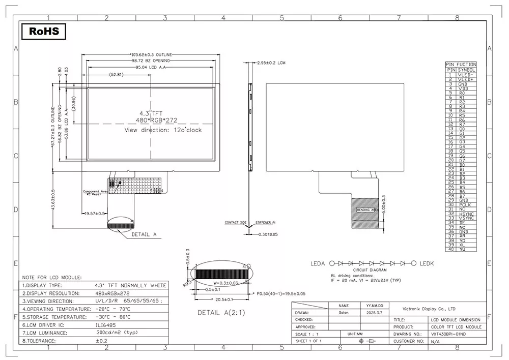 Bu Victronix 4.3 düym 480 × 272 Sənaye TFT modulu, sağlam və çox yönlü sənaye tətbiqləri üçün hazırlanmış yüksək effektiv 4.3 düymlük TFT-LCD moduludur. Kəskin 480 × 272 qətnamə və 16,7 milyon rəngə qədər dəstək verən, standart bir RGB interfeysi vasitəsilə canlı və ətraflı vizual çıxışı təmin edir. Ili6485 seriyalı nəzarətçi tərəfindən idarə olunan Modul, saat 12-də 65 ° istiqamətində geniş bir baxış, 700: 1-in yüksək bir kontrast nisbəti və 20 ms sürətli cavab müddəti, dinamik ekran ssenarilərində hamar bir performans təmin edir. Çində peşəkar bir istehsalçı və TFT modullarının tədarükçüsü olaraq, bu, bu Viktoriya 4.3 düymlük TFT modulu, üstün tətbiq performansını təmin edən RoHS ekoloji standartlarına tam uyğundur. Müştərilərimizin ehtiyaclarını ödəmək üçün xüsusi bir xidmət təklif edirik.