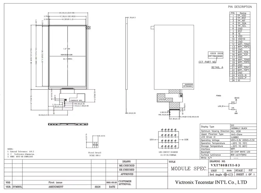 Bu Victronix 7 düymlük 800x1280 MIPI TFT Modulu, etibarlılıq və vizual aydınlıq üçün hazırlanmış sağlam və çox yönlü 7 düymlük TFT-LCD moduludur. Bir xırtıldayan 800 × 1280 piksel qətnamə və 0.11775 mm piksel meydançası olan bu modul kəskin şəkillər və ətraflı qrafika təqdim edir. Çində peşəkar bir TFT modulu istehsalçısı və təchizatçı kimi, bu Victronix 7 düymlük TFT modulu, üstün tətbiq performansını təmin etmək üçün ROHS ekoloji standartlarına uyğundur.