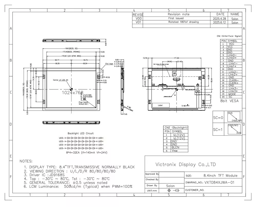 Victronix tərəfindən bu 8.4 düymlük TFT displeyi, ümumiyyətlə, sənaye HMIS, tibbi cihazlarda, donanma / nəqliyyat vasitələrində və bütün hava oxunuşu və uzunmüddətli etibarlılığı tələb edən açıq avadanlıqlarda istifadə olunur.